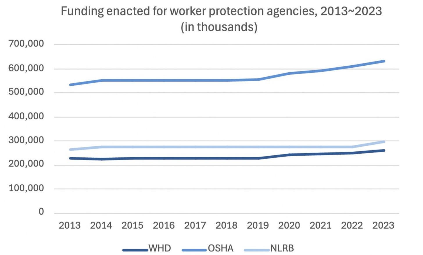 As shown in Figure A, funding enacted for worker protection agencies such as the WHD, OSHA, and NLRB was almost stagnant between 2013 and 2023. This prevented agencies from building the capacity necessary to fulfill their missions: for example, after almost a decade without a funding boost, the NLRB was forced to enact a hiring freeze, despite staffing shortfalls in field offices across the U.S. This trend of nearly flat funding—paired with inflation and the growing demands for the agencies’ work described in Table A—leaves these agencies with little capacity to endure the steep cuts House Republicans have proposed without jeopardizing their ability to protect working people.