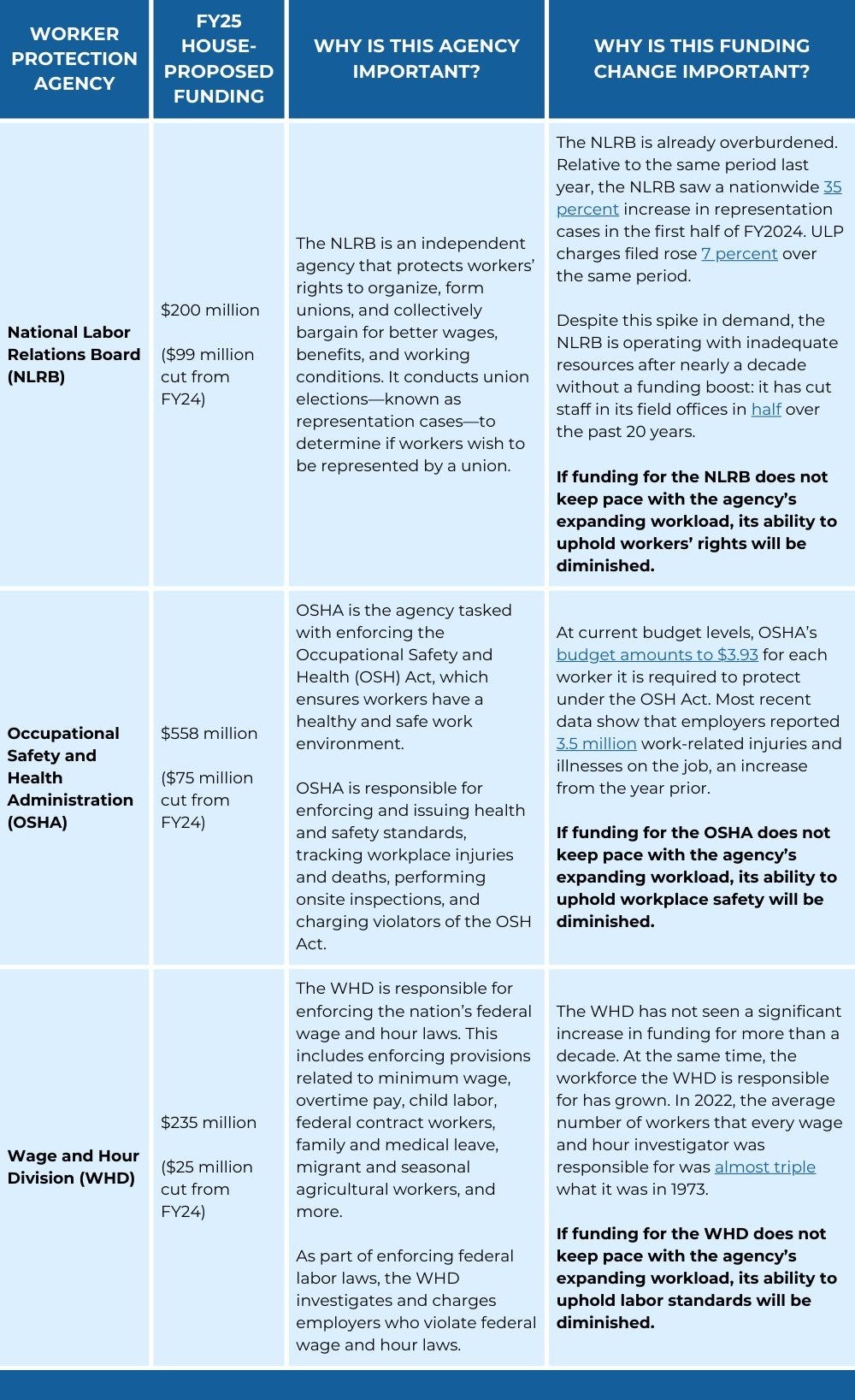 This explainer describes the impacts the House-proposed funding cut would have on specific worker protection agencies within DOL—the Occupational Safety and Health Administration (OSHA) and the Wage and Hour Division (WHD)—and on the independent National Labor Relations Board (NLRB). Table A below outlines the cuts each agency would endure and the implications for workers.